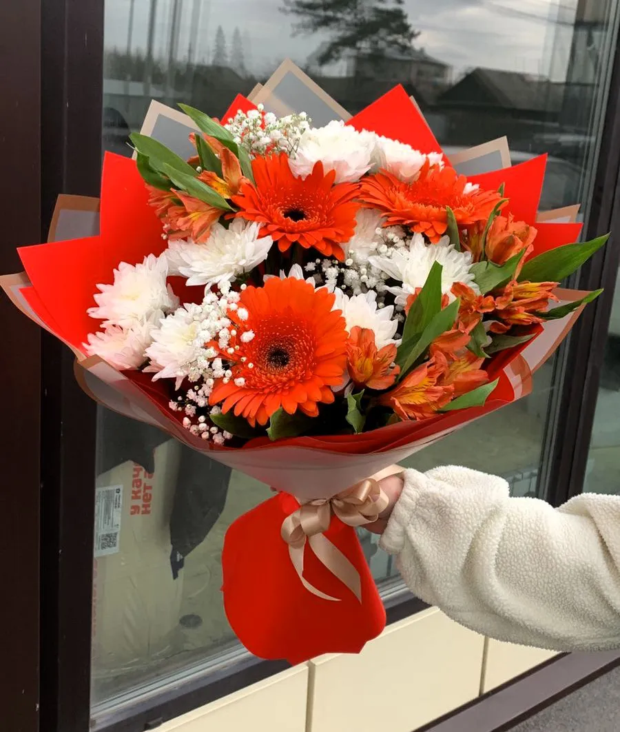 Этот букет – настоящий взрыв красок и позитивной энергии! Яркие красные герберы, словно лучи солнца, наполняют композицию радостью и жизнелюбием. Изящные альстромерии добавляют нежности и изысканности, а белоснежные хризантемы вносят нотку свежести и утонченности. Это цветочная композиция – идеальный подарок, чтобы подарить внимание, выразить благодарность или просто сделать день особенным. Позвольте этому букету принести счастье и улыбку!