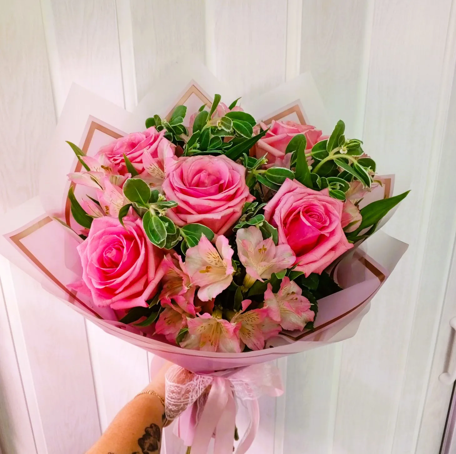 Букет из розовых роз и альстромерий — это настоящая симфония нежности и элегантности. Розовые розы с их грациозными бутончиками символизируют любовь и восхищение, их мягкие лепестки словно окутаны утонченной гармонией. Альстромерии, с яркими и многообразными оттенками, добавляют букету живости и динамики, наполняя его игривостью и радостью.