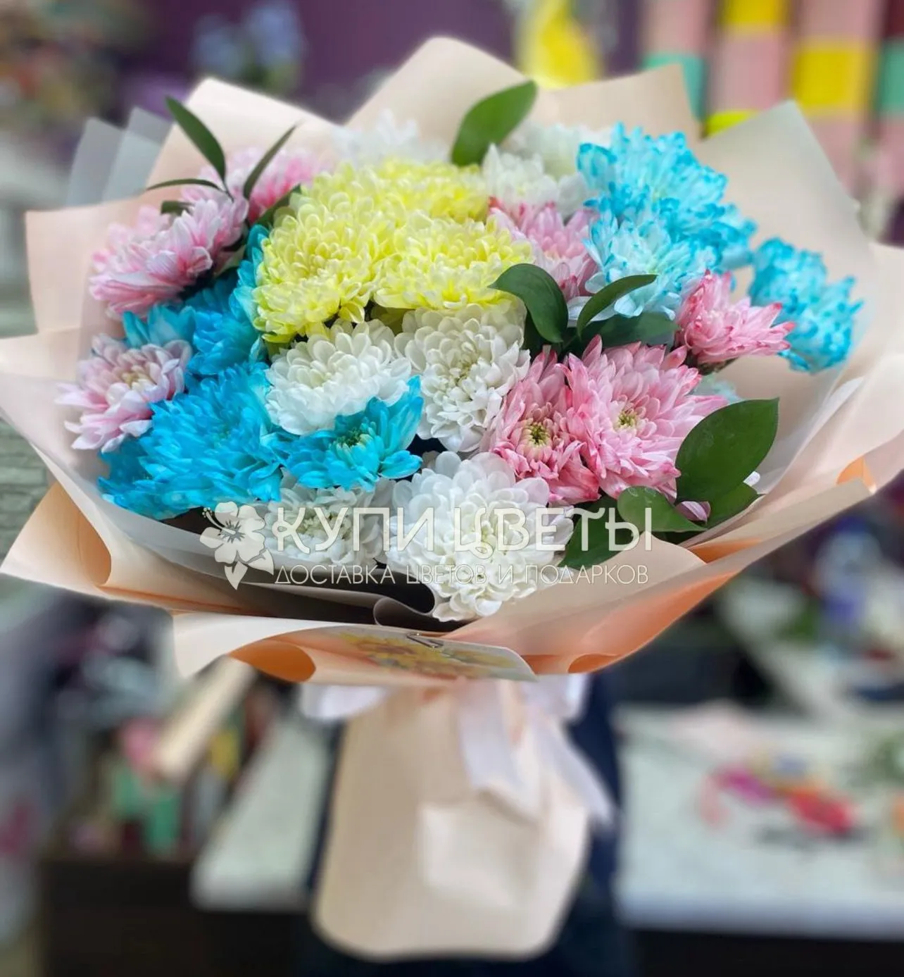 Кустова хризантема, зелень, упаковка, лента