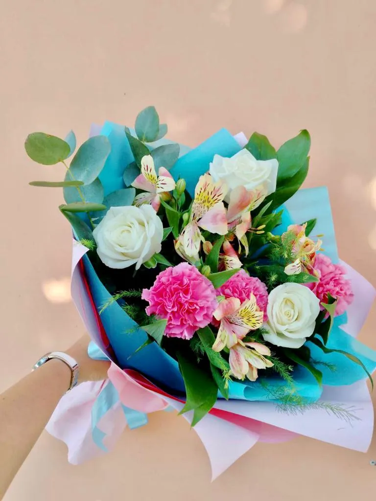Роза ,гвоздика, альстромерия, эустома, зелень, упаковка, лента