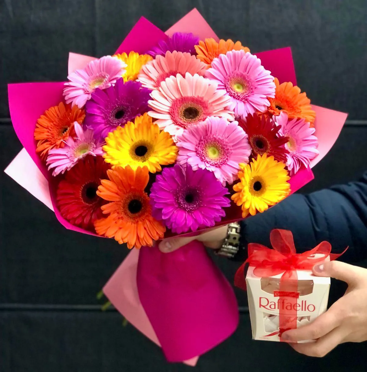 • Средний ( гербера - 9 шт., упаковка, лента + рафаэлло)