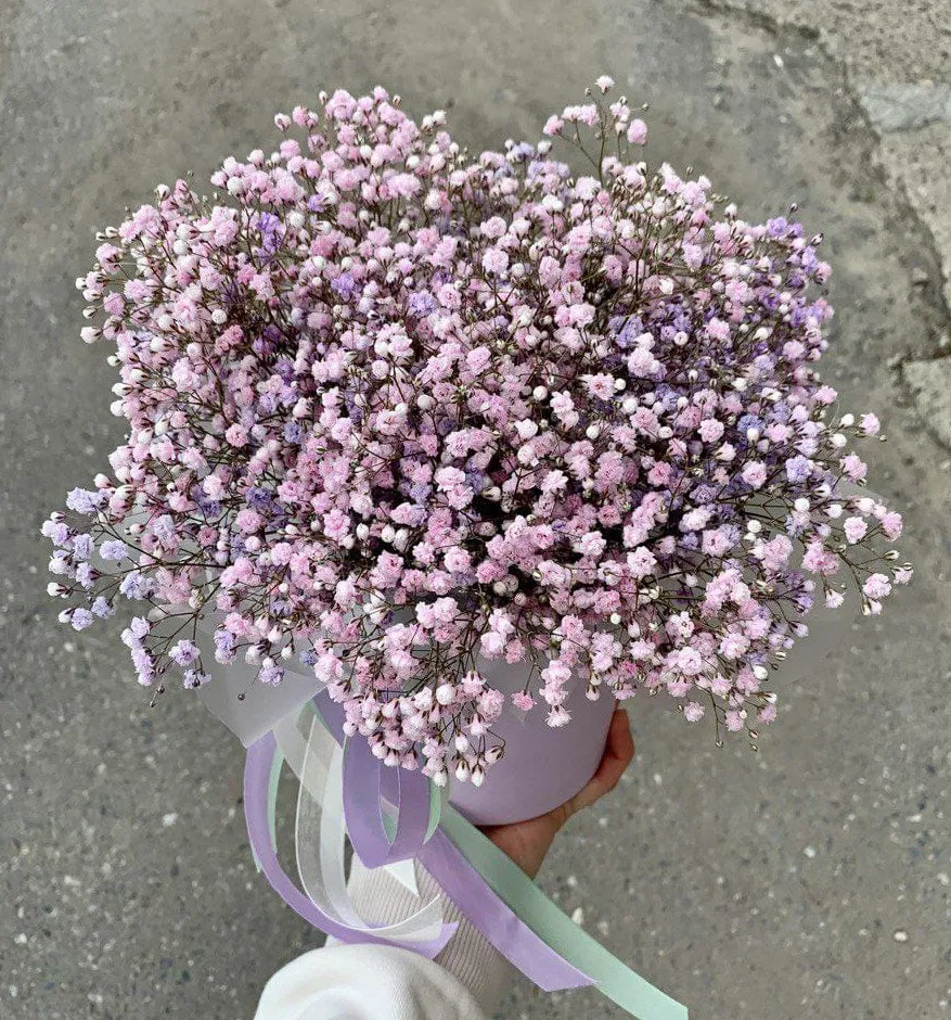 Такое оформление станет великолепным подарком, способным передать самые искренние чувства и создать незабываемую атмосферу во всех торжествах. Шляпная коробка с фиолетовой гипсофилой – это не просто букет, а настоящая история о нежности, любви и гармонии.