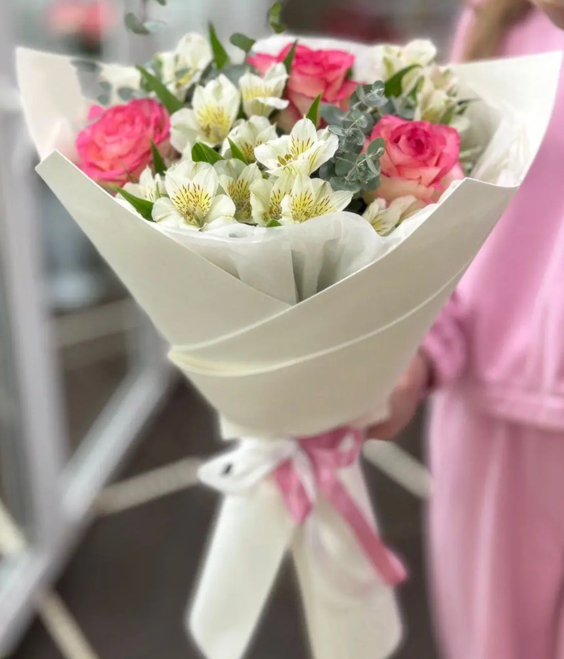Букет из розовых роз и альстромерий Лёгкость чувств