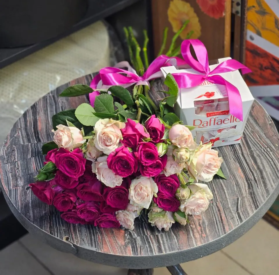 • Делюкс - кустовая роза 15 шт, лента, рафаэлло