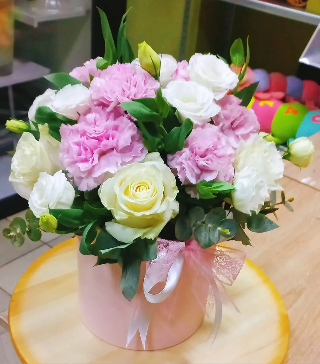 • Стандарт - эустома - 4 шт., роза - 5 шт., гвоздика - 7 шт., шляпная коробка, оазис
