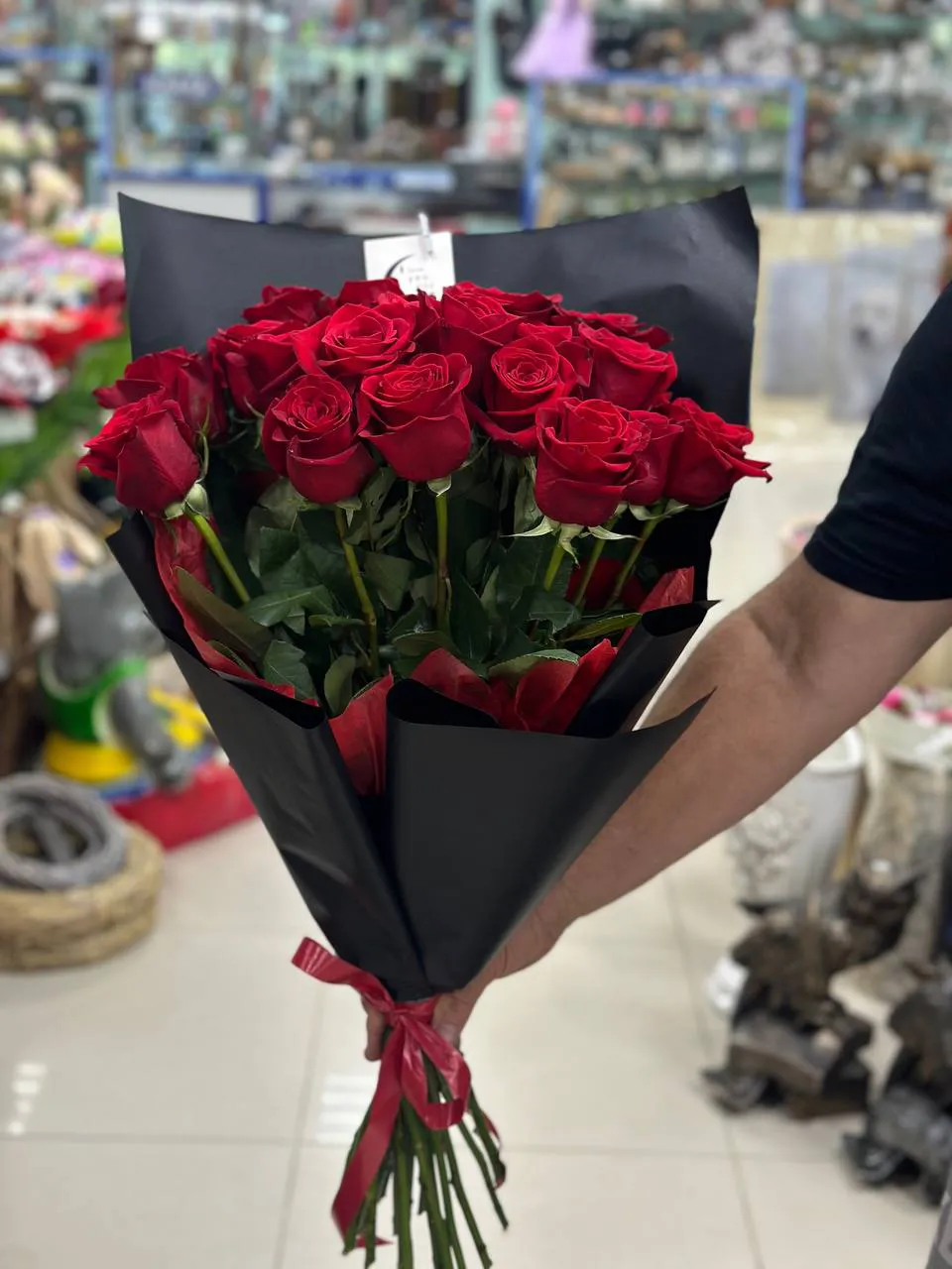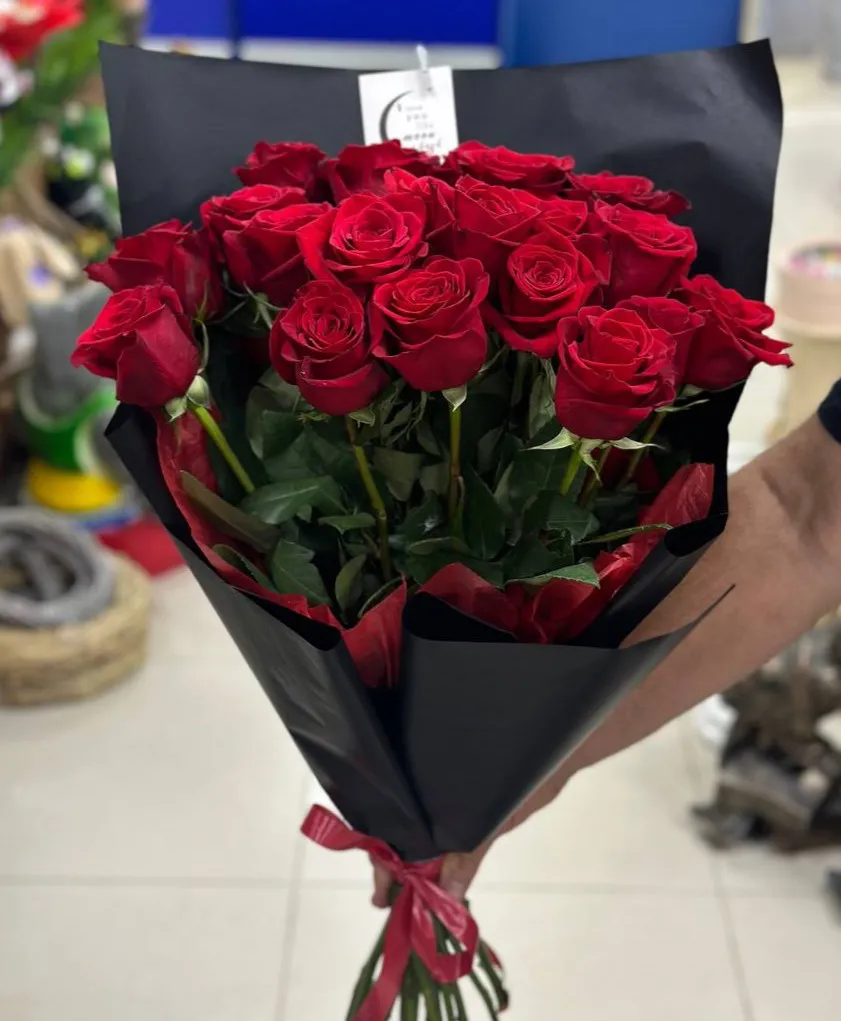 Черная упаковка обвивает стебли, словно обнимая их, подчеркивая хрупкость и грацию роз, придавая букету нотку загадочности. Этот гармоничный союз цветов и упаковки символизирует страсть и страстные чувства, приглашая нас в мир волшебства и любви. Такой букет станет не только подарком, но и настоящим произведением искусства, способным украсить любое торжество или внести яркий акцент в повседневность.