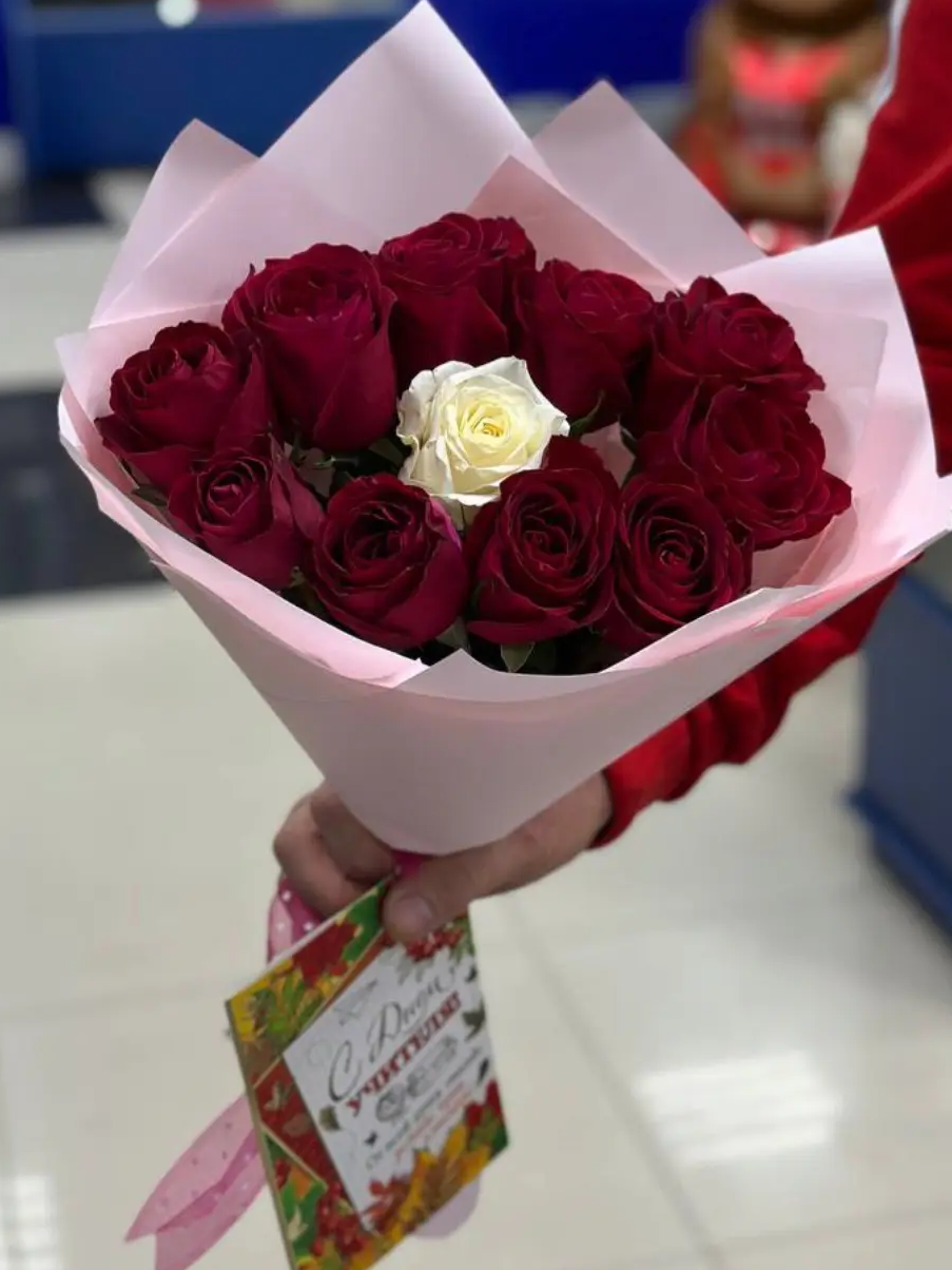 Красные розы олицетворяют любовь, восхищение и глубокие эмоции, а белая роза в центре - искренность, верность и особенность того, кому предназначен букет. Стильная упаковка подчёркивает изысканность композиции, делая её идеальным подарком для признания, романтического жеста или особого случая.