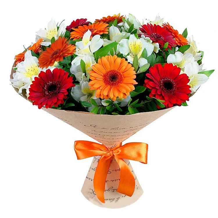 герберы, альстромерии, зелень, упаковка, лента