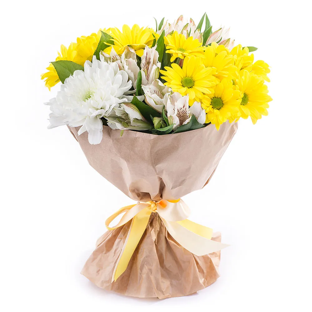 • Стандарт (хризантема желтая кустовая - 2 шт; хризантема белая - 1; альстромерия - 4 шт.; зелень; упаковка; лента)