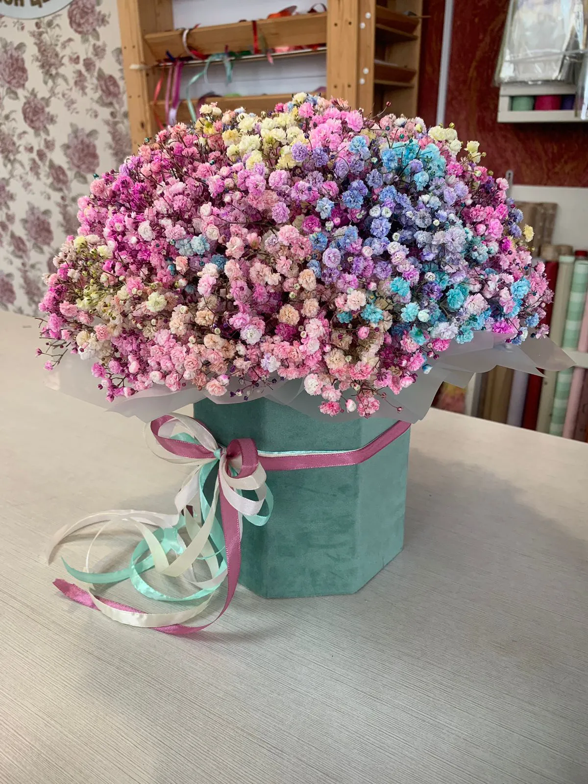 —Букет из радужной гипсофилы в шляпной коробке