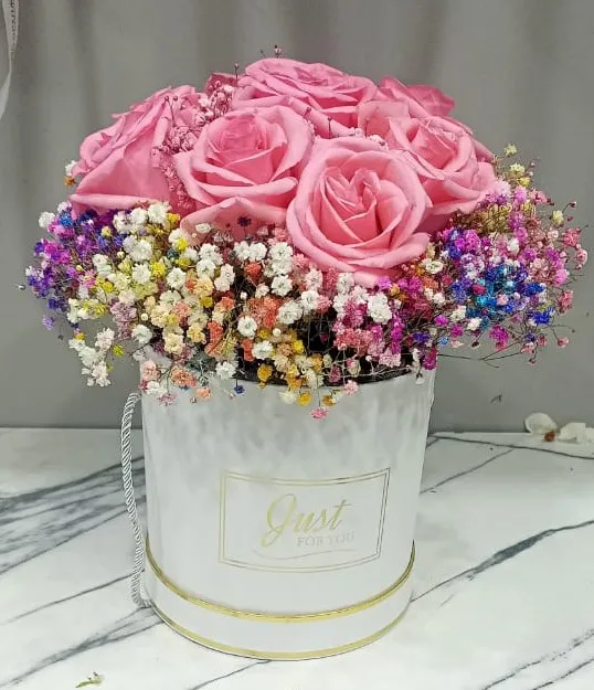 Разноцветная гипсофила и розовые розы — это гармония нежности и изящества, созданная природой. Яркие облака гипсофилы, как облака весеннего неба, окружают роскошные розы, придавая им легкость и элегантность. Лепестки роз, окрашенные в разнообразные оттенки — от нежно-розового до насыщенного малинового — излучают тепло и чувственность, придавая букету романтическое настроение.