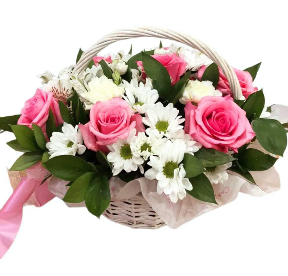 • Стандарт - роза - 5 шт; кустоые хризантемы - 3 шт; альстромерии 2 - шт; зелень, корзина, оазис