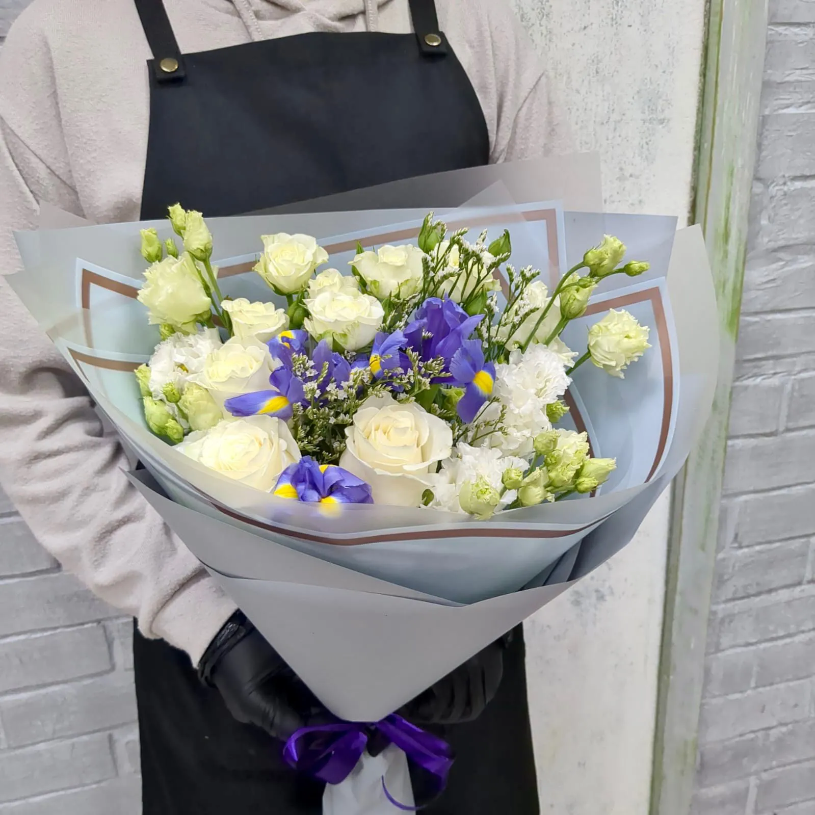 Вариант—Стандарт - роза - 3 шт., ирис - 3 шт., эустома - 2 шт., роза кустовая - 1 шт., зелень, упаковка, лента