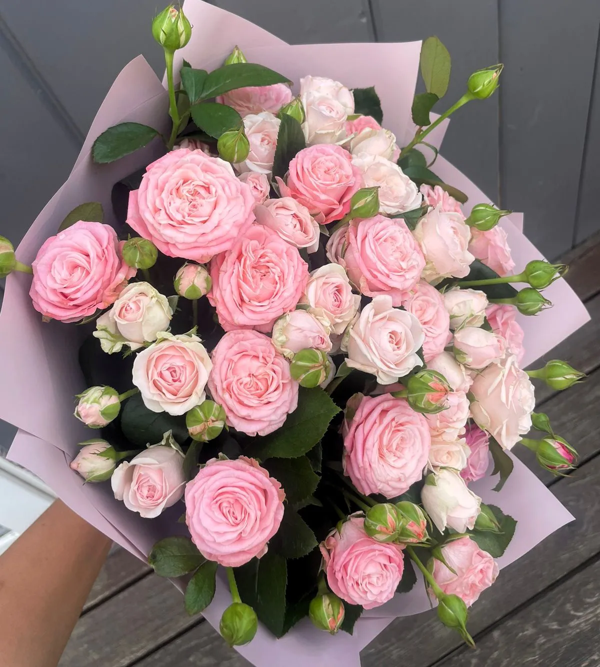 Букет из нежно розовых кустовых роз — это воплощение утонченной красоты и изящества. Мягкие пастельные оттенки лепестков, словно пробуждающиеся весной, создают атмосферу нежности и гармонии. Каждая роза, с её округлыми формами и бархатистой текстурой, кажется, дышит жизнью и любовью.
